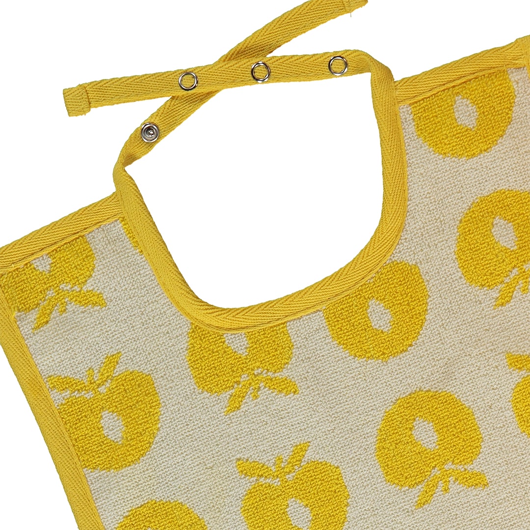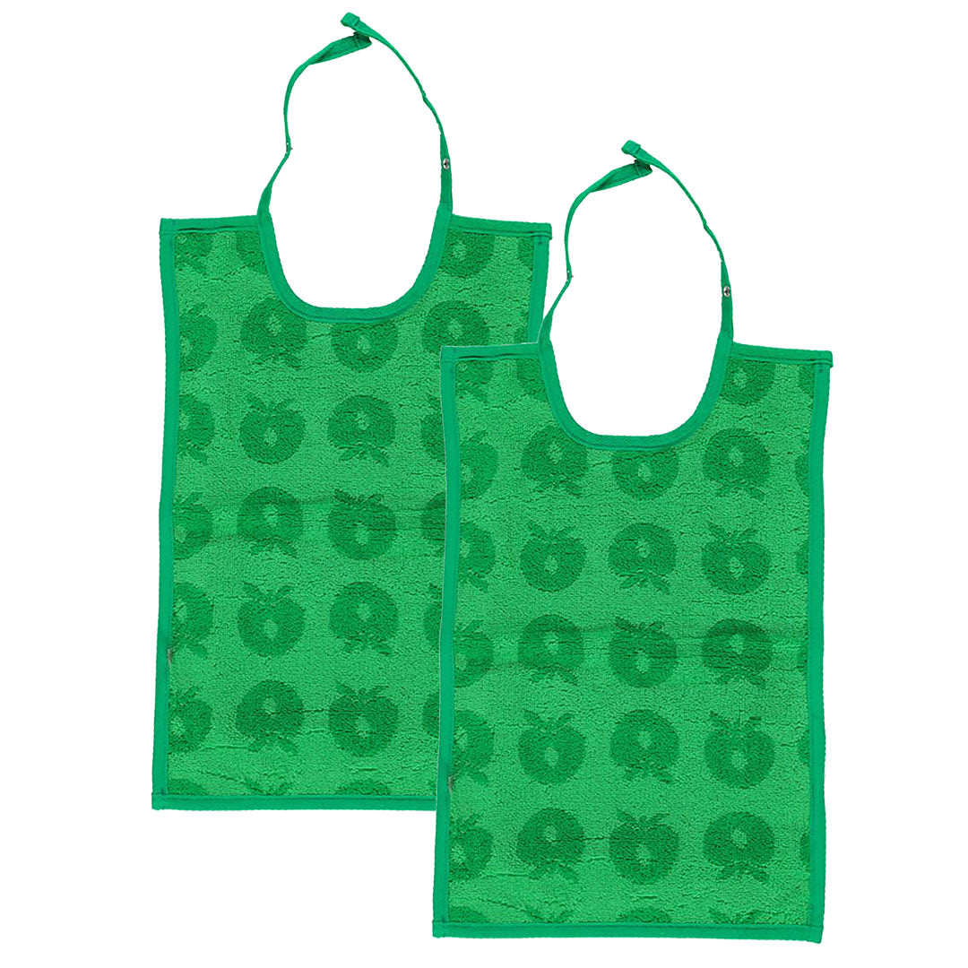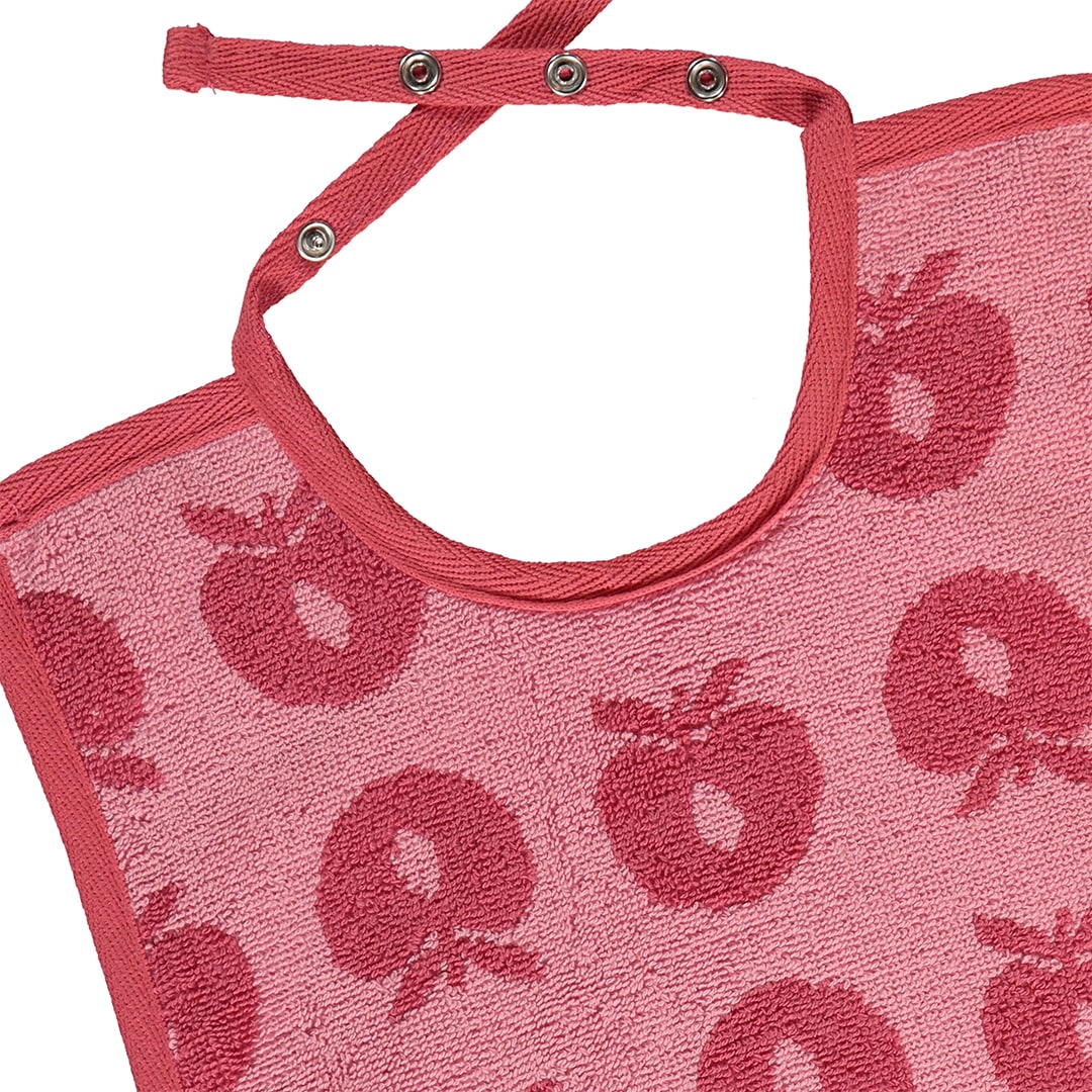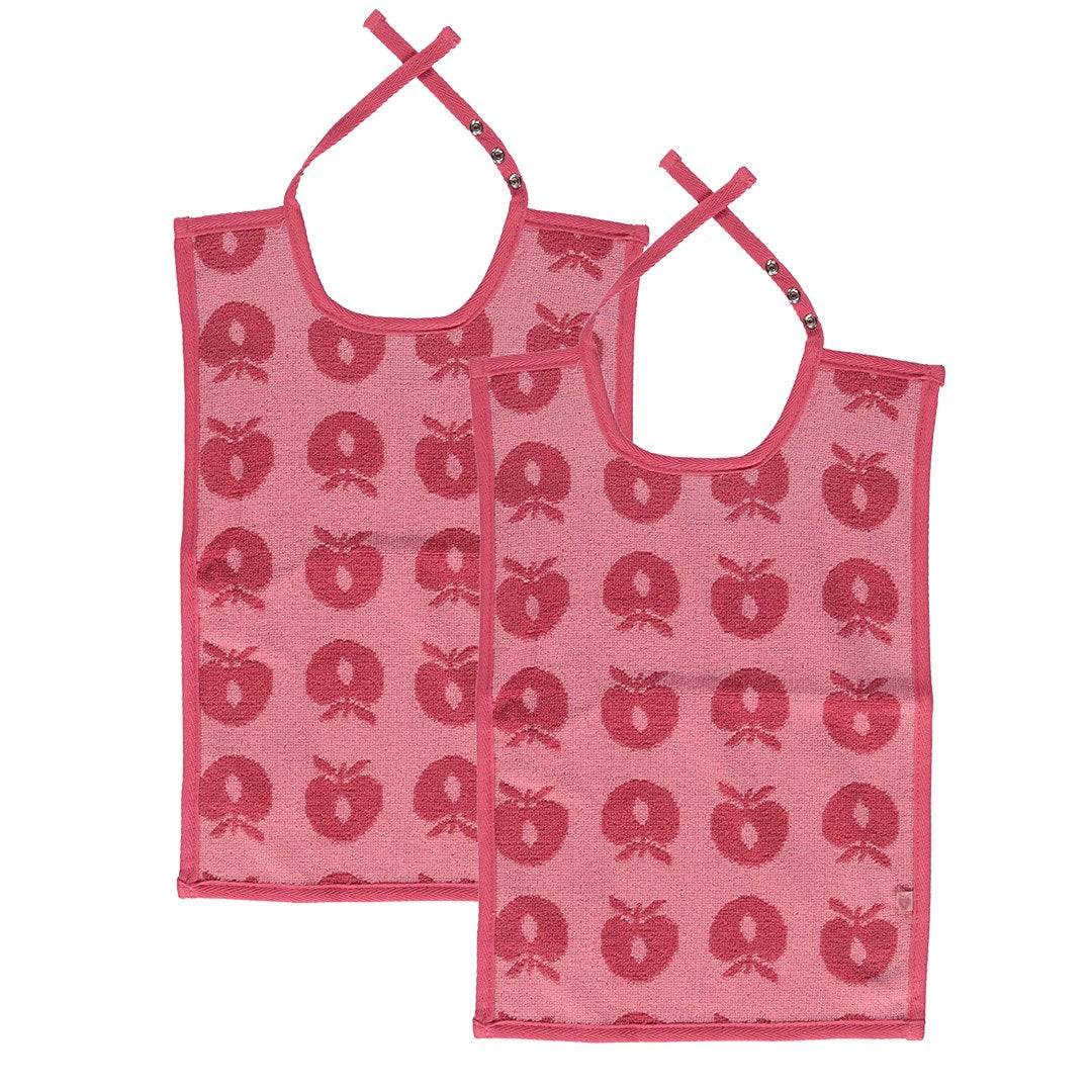Hagesmækken har bindebånd med trykknapper, så hagesmækken nemt kan tilpasses barnet og måler 28x45 cm