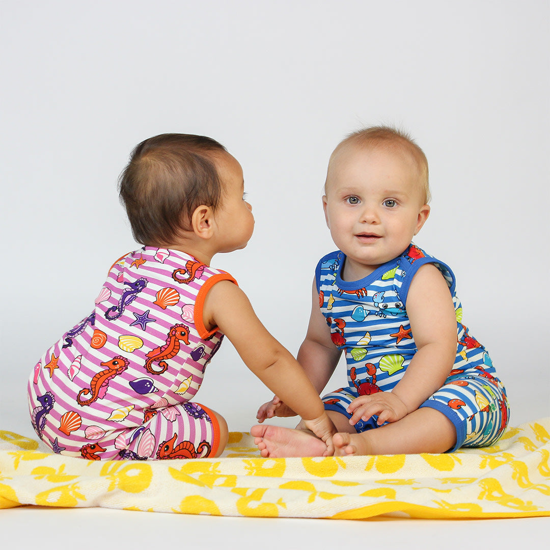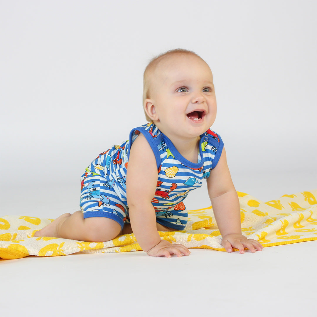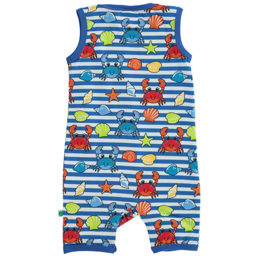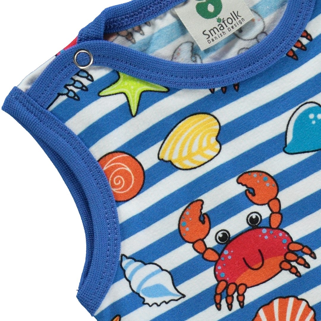 Ærmeløs heldragt med krabber, produceret i en økologisk og strækbar bomuldsjersey. Denne heldragt er OEKO-TEX Standard 100® certificeret, hvilket betyder at denne heldragt er produceret og testet for skadelige stoffer, så du kan passe på dit barns hud og helbred. Heldragten har en normal pasform med kuvertlukning og trykknapper, samt ribkanter. Småfolks heldragt er designet i Danmark med tanke på at kunne holde til utallige eventyrer og leg, og bevare form og farver selv efter gentagen brug.