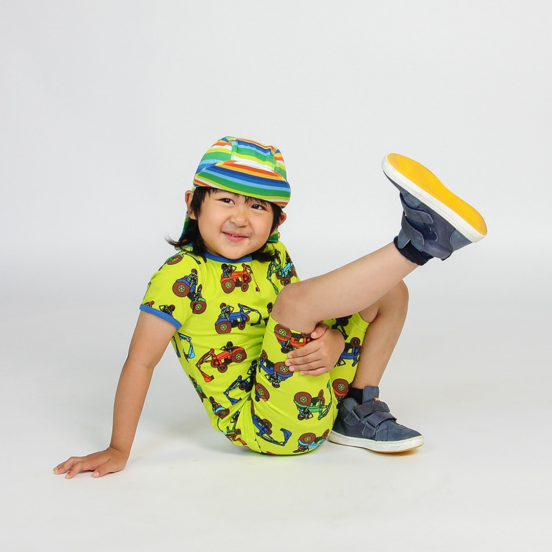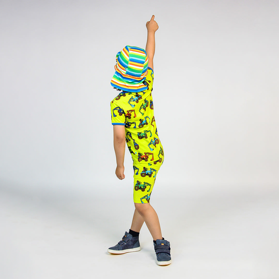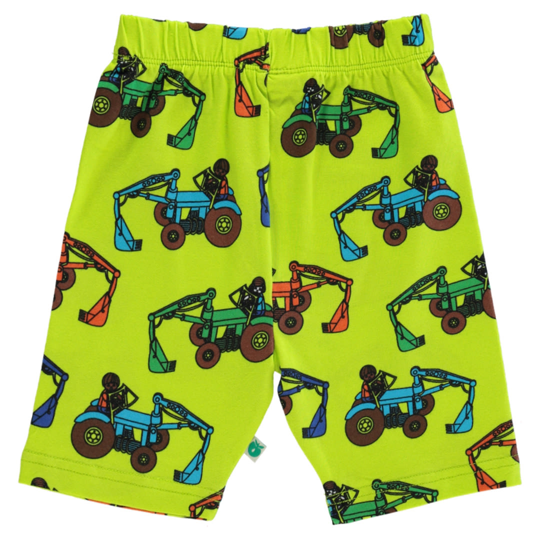 Cykelshorts med traktorer, produceret i en økologisk og strækbar bomuldsjersey. Disse cykelshorts er OEKO-TEX Standard 100® certificeret, hvilket betyder at disse shorts er produceret og testet for skadelige stoffer, så du kan passe på dit barns hud og helbred. Disse shorts har en normal pasform og elastik i livet. Småfolks shorts er designet i Danmark med tanke på at kunne holde til utallige eventyrer og leg, og bevare form og farver selv efter gentagen brug.