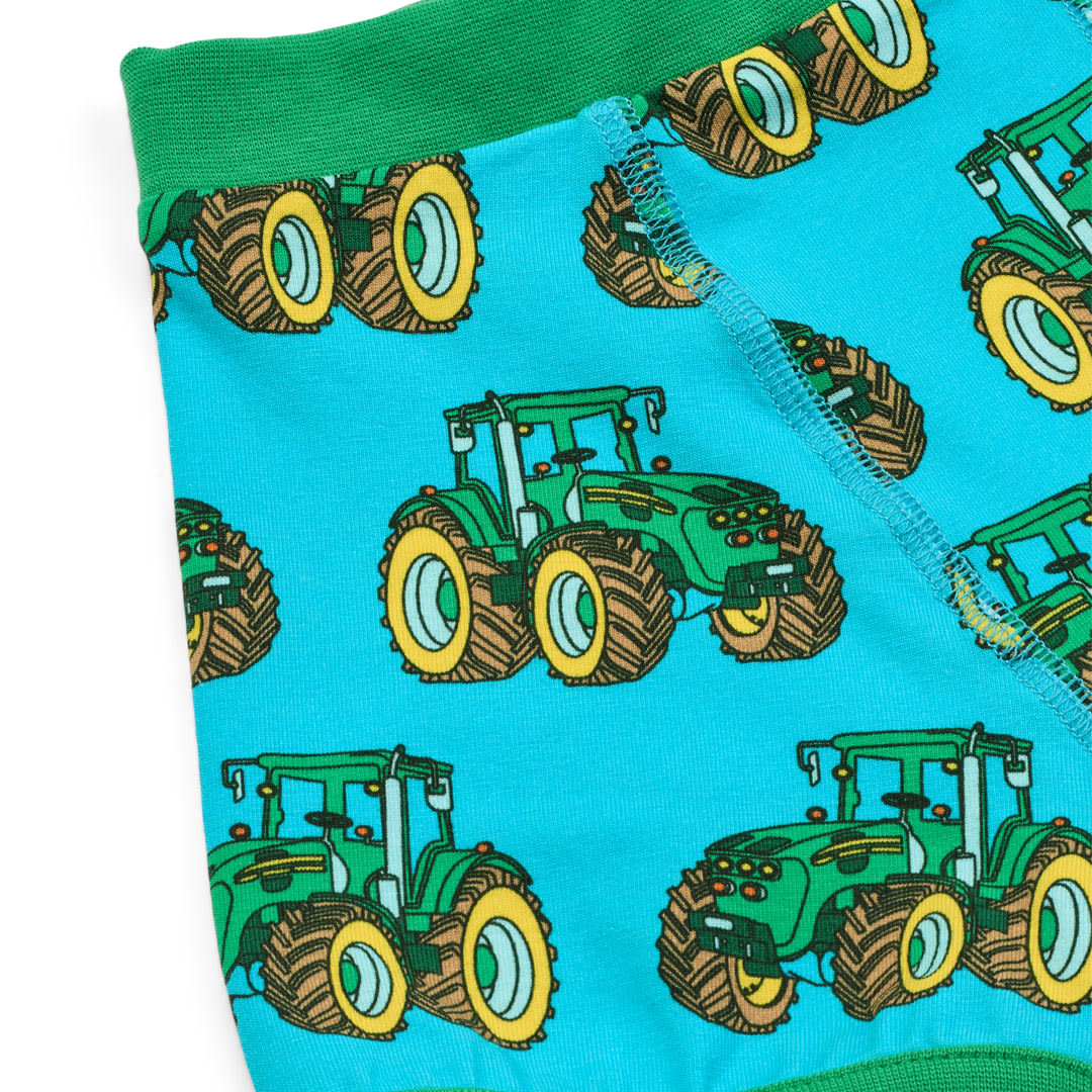 Æbleprintet fremhæver Småfolks legende oprindelse, mens traktorprintet tilføjer et strejf af eventyr. Lyse, glade farver og sjove motiver gør dette sæt til en livlig og praktisk tilføjelse til dit barns garderobe, perfekt til hverdagsbrug.