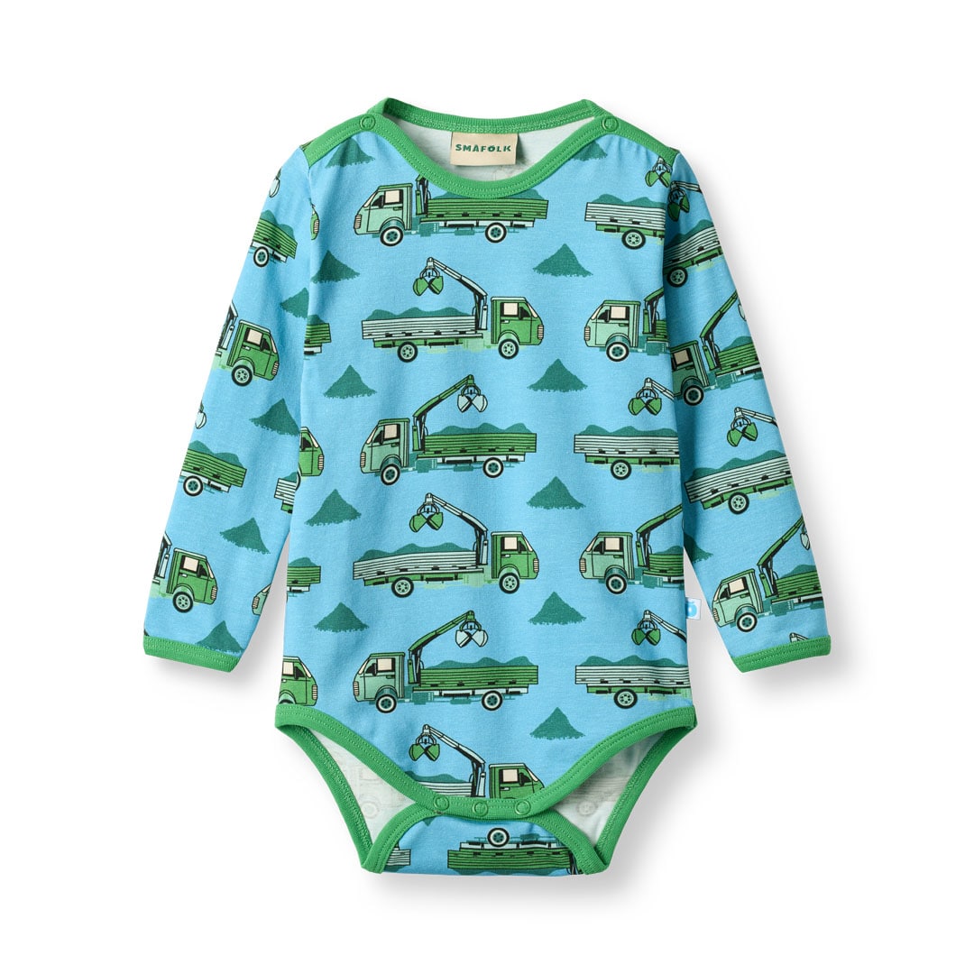 Tank op for sjov med vores dynamiske lastbilprint, perfekt til små flyttemænd, der elsker store opgaver og travle byggepladser. Småfolks print er tegnet med fokus på glade farver, detaljer og historier. Vores bodyer er en god måde at tilføje personlighed til dit barns garderobe, samtidig med at dit barn kan føle sig komfortabel hele dagen.