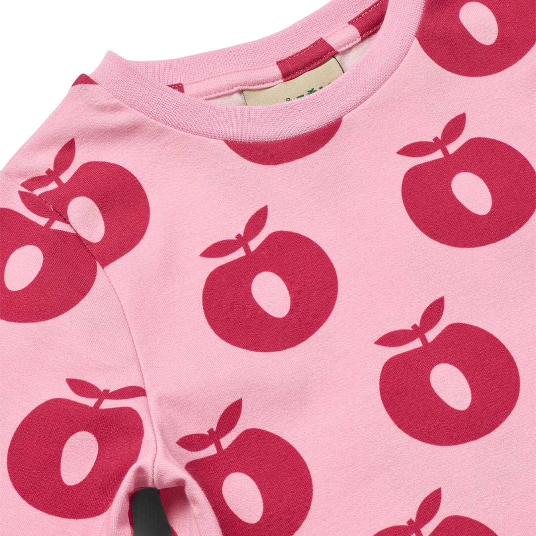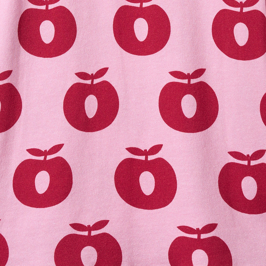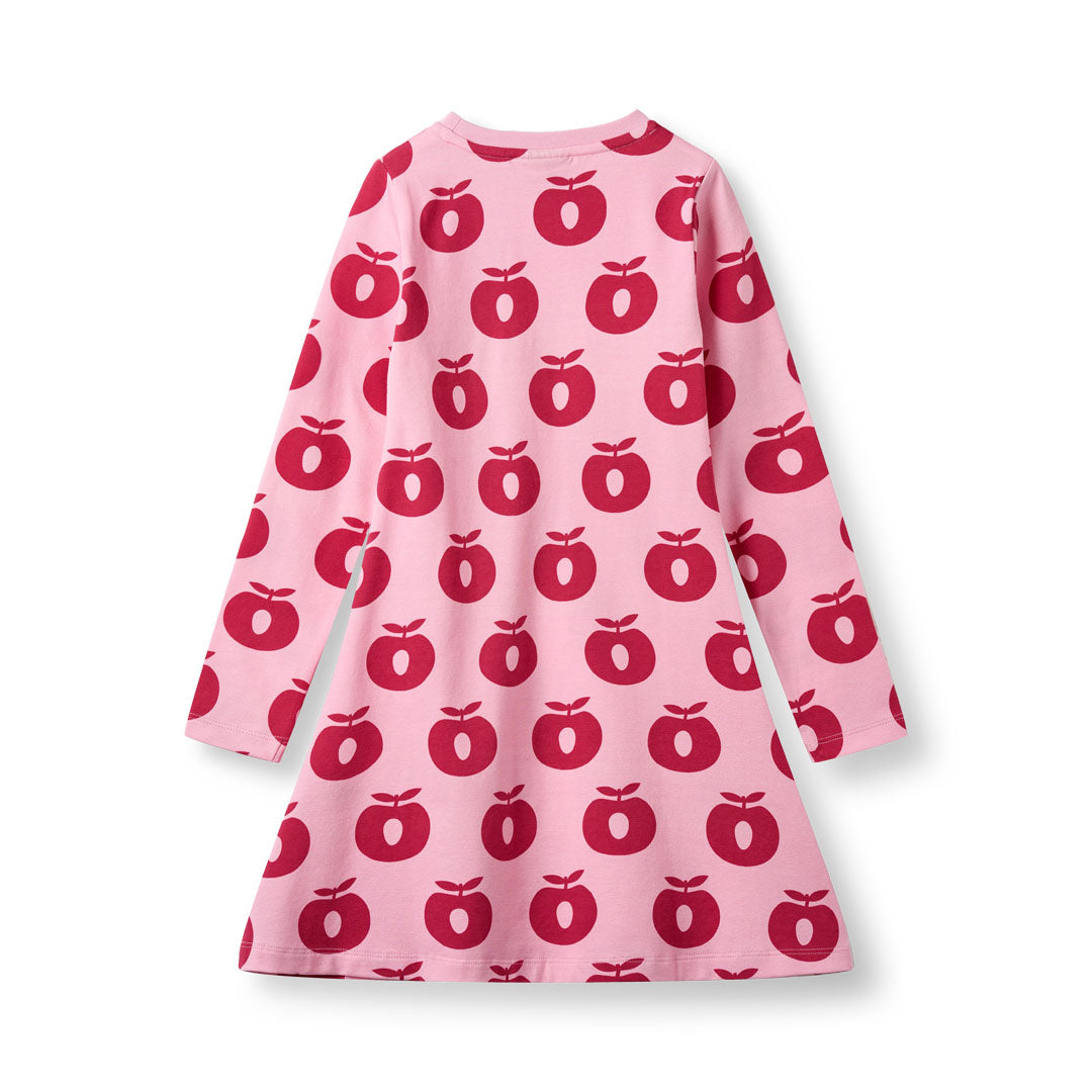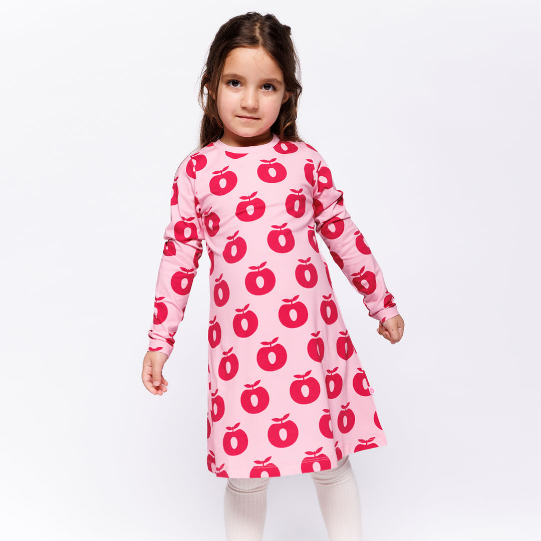 Langærmet kjole med æbler, produceret i en økologisk og strækbar bomuldsjersey. Denne kjole er OEKO-TEX Standard 100® certificeret, hvilket betyder at kjolen er produceret og testet for skadelige stoffer, så du kan passe på dit barns hud og helbred.