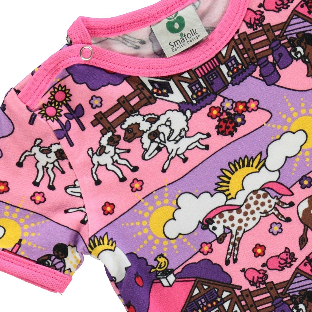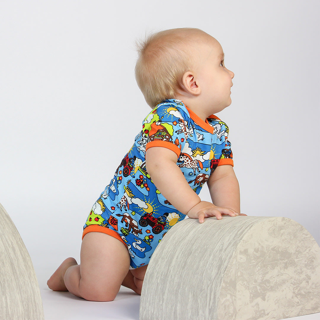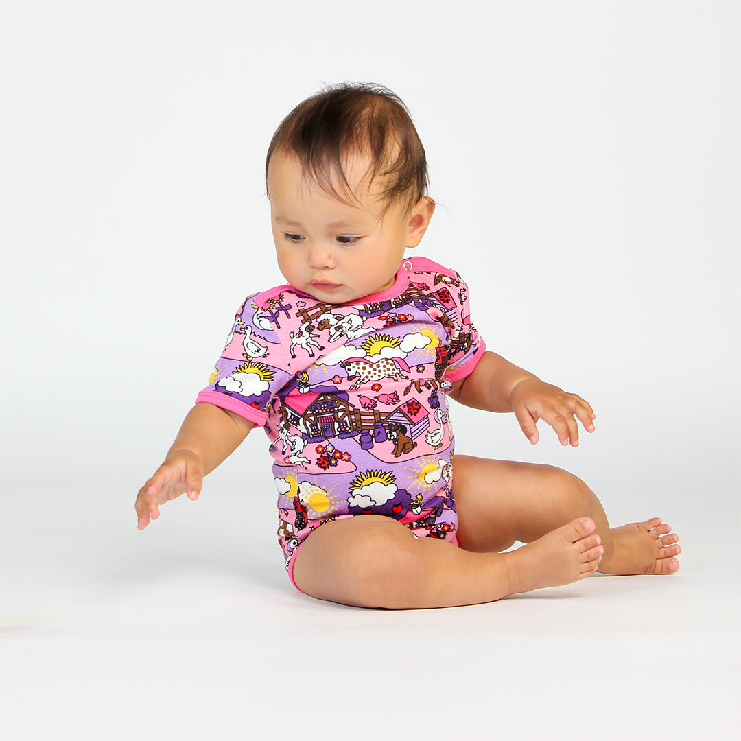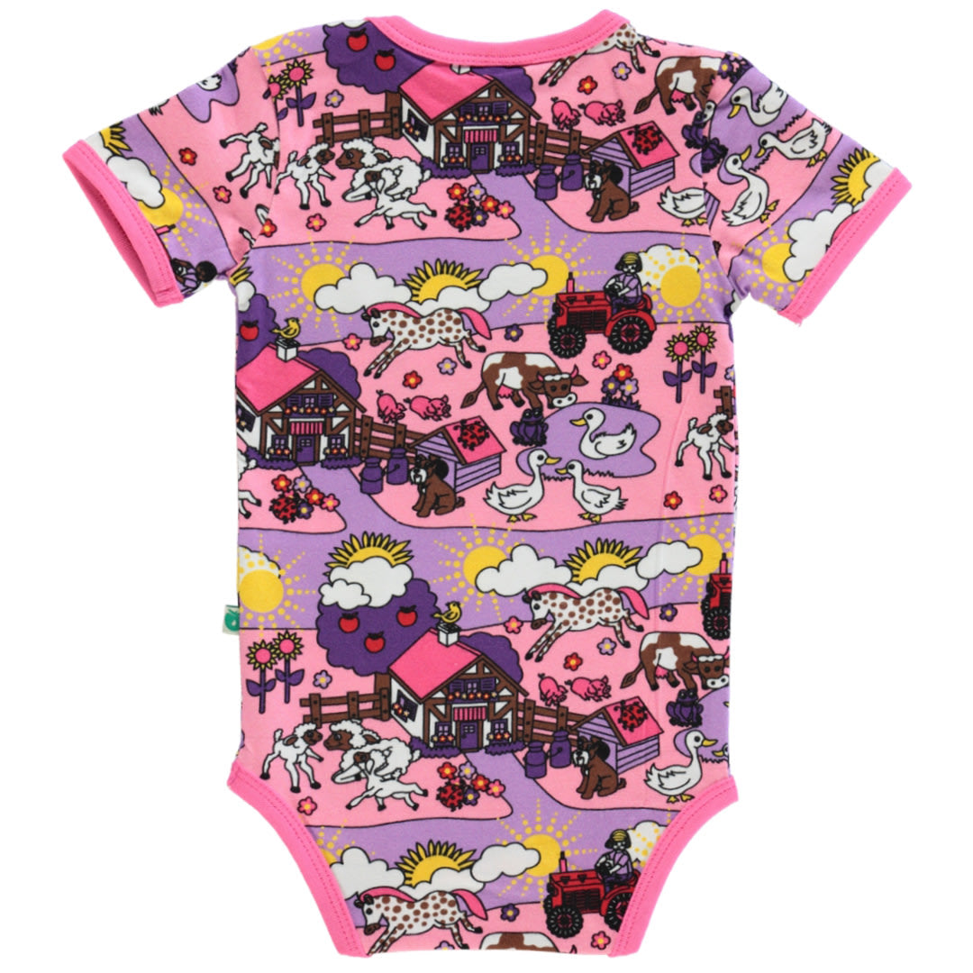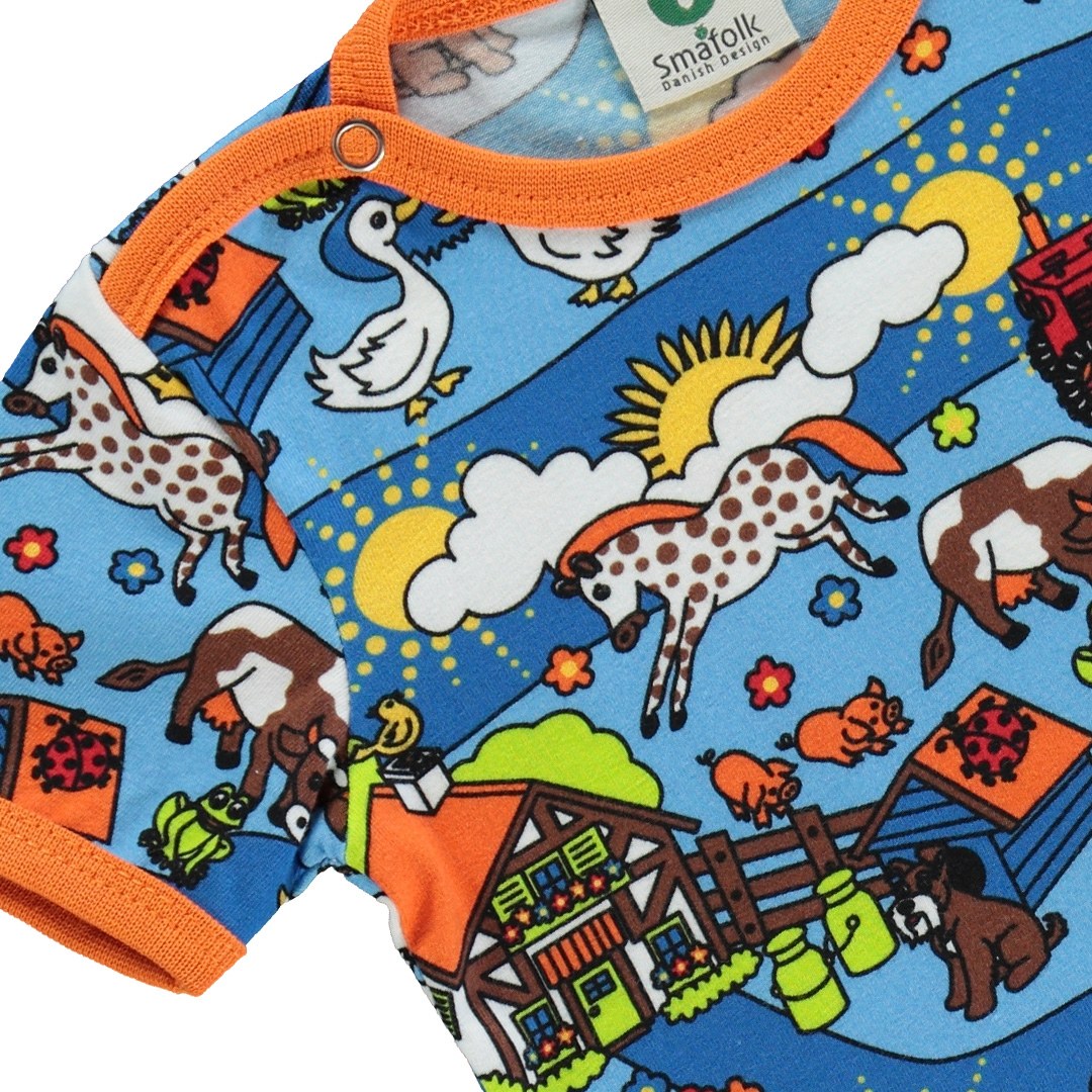 Kortærmet body med bondegård, produceret i en økologisk og strækbar bomuldsjersey. Denne body er OEKO-TEX Standard 100® certificeret, hvilket betyder at denne body er produceret og testet for skadelige stoffer, så du kan passe på dit barns hud og helbred. Denne body er designet med trykknapper på skuldrene samt for neden, for nemt skift. Småfolks body er designet i Danmark med tanke på at kunne holde til utallige eventyrer og leg, og bevare form og farver selv efter gentagen brug.