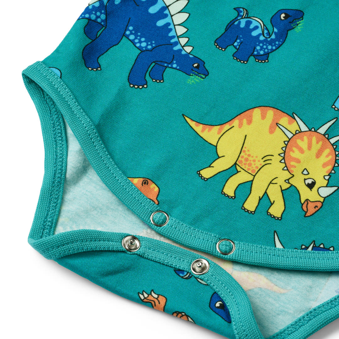 Kortærmet body med dinosaurer, produceret i en økologisk og strækbar bomuldsjersey. Denne body er OEKO-TEX Standard 100® certificeret, hvilket betyder at denne body er produceret og testet for skadelige stoffer, så du kan passe på dit barns hud og helbred. Denne body er designet med trykknapper på skuldrene samt for neden, for nemt skift. Småfolks body er designet i Danmark med tanke på at kunne holde til utallige eventyrer og leg, og bevare form og farver selv efter gentagen brug.