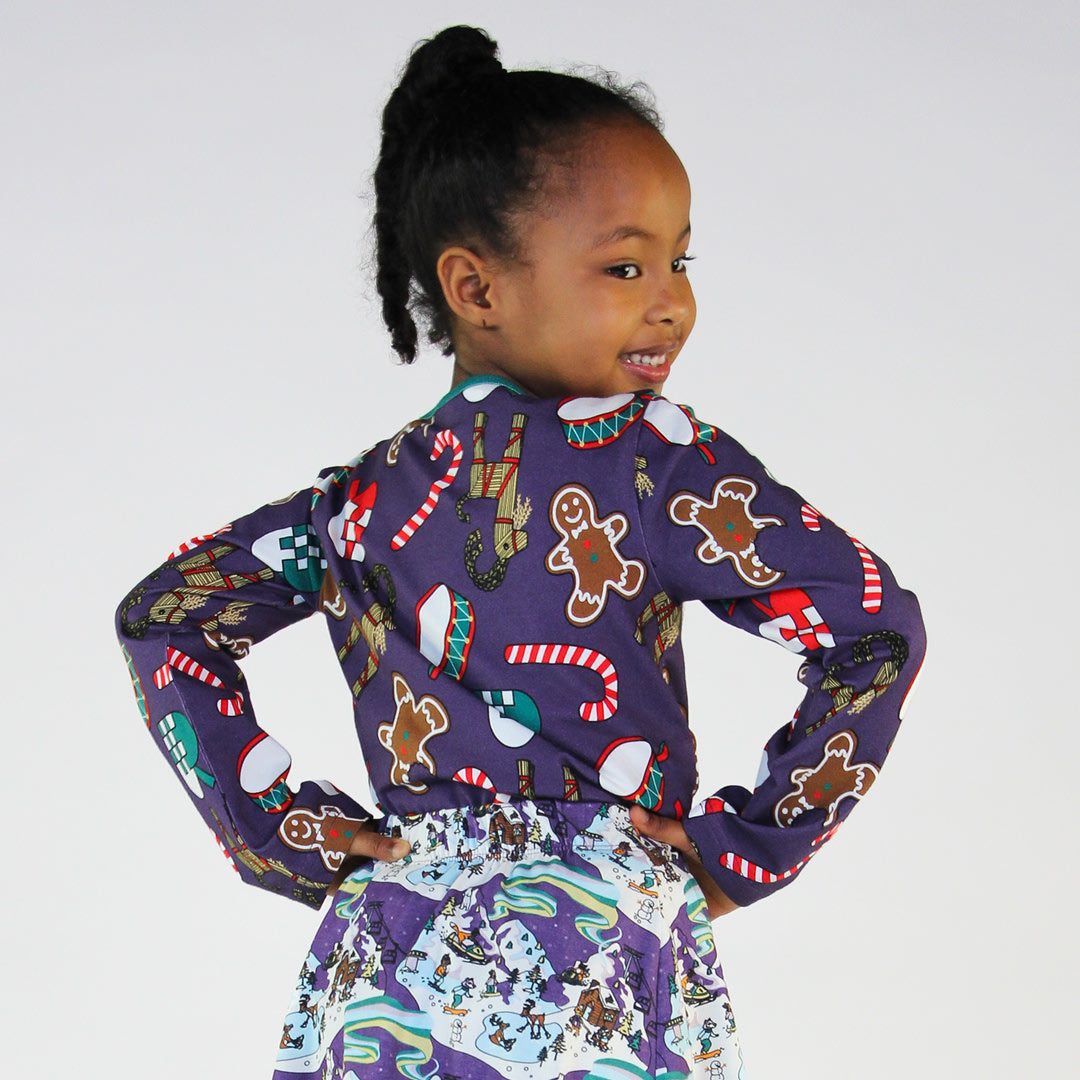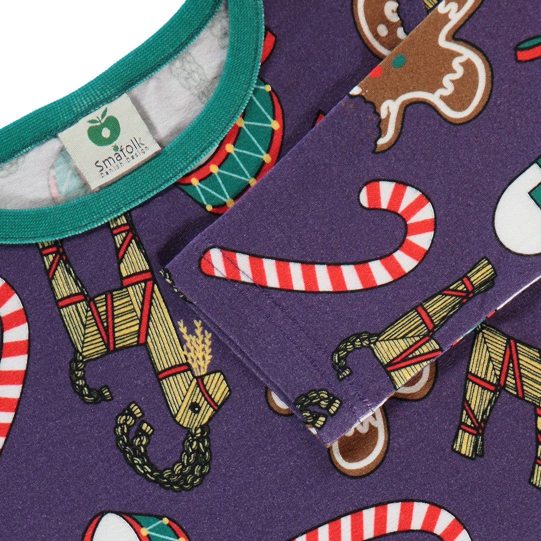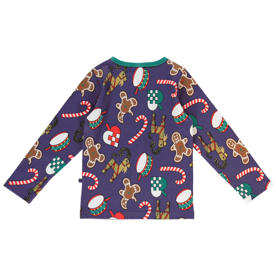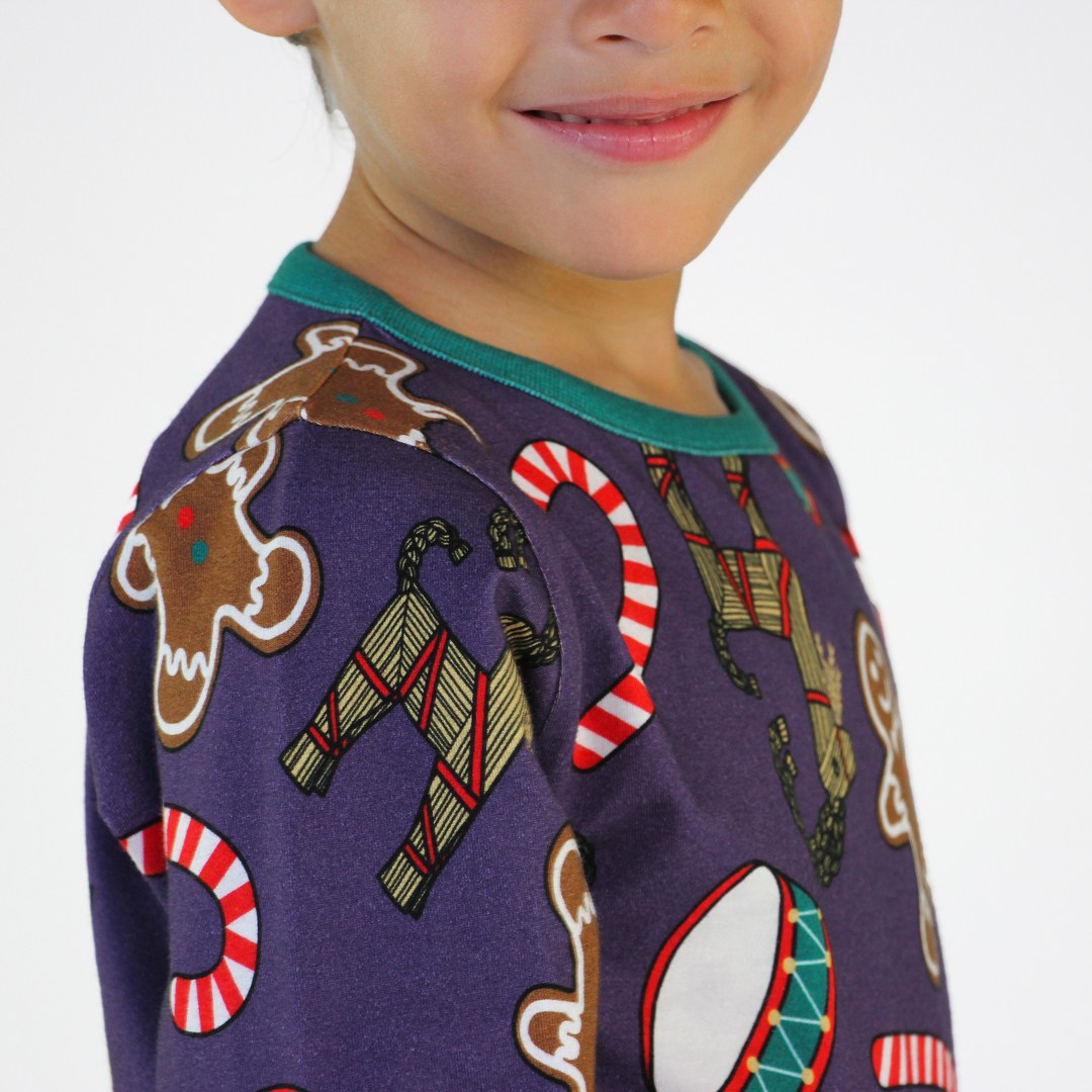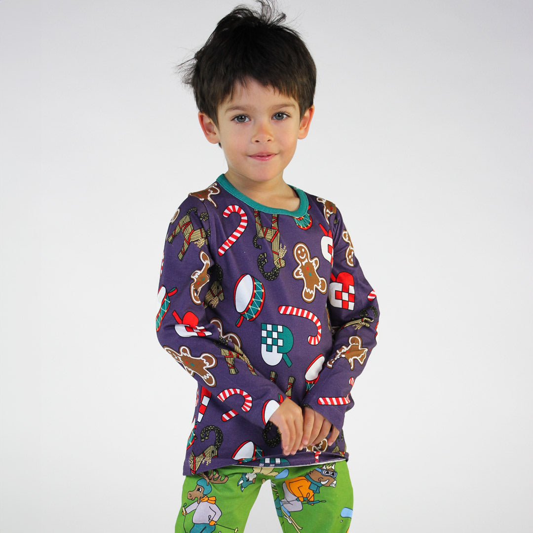 Dette dejlige juletema-print indeholder noget for enhver smag. Printet er en fejring af sæsonen og viser nogle danske juletraditioner som de håndfoldede julehjerter, trommen, julebukken lavet af hø og de søde slik julestokke. Småfolks print er tegnet med fokus på glade farver, detaljer og historier. Vores langærmede bluser er en god måde at tilføje personlighed til dit barns garderobe, samtidig med at dit barn kan føle sig komfortabel hele dagen.