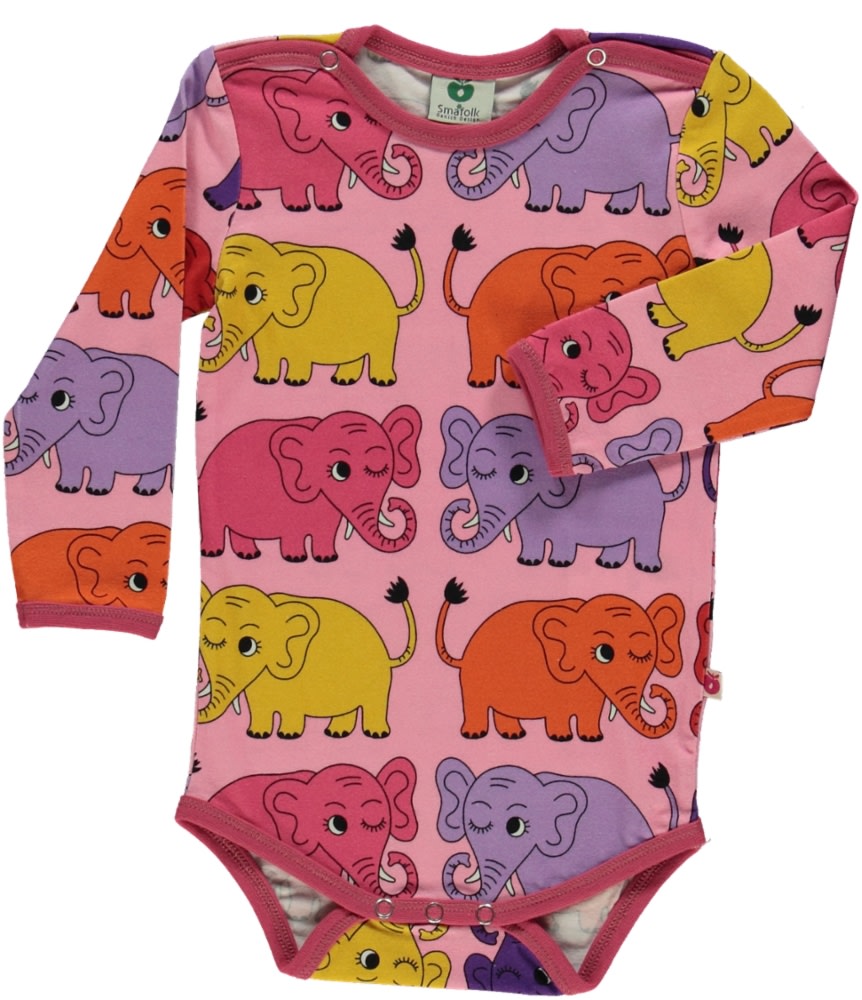 Body med elefanter i Småfolks helt egen unikke retro stil. Bodyen har trykknapper på skuldrene for nemt skift. Bodyen er designet i Danmark og produceret i den aller bedste 100% økologiske bomuld samt elastan, som gør bodyen strækbar, blød og samtidig holder pasformen. Småfolks bodyer er i flotte klare farver som dit barn kan lege, vokse og udforske deres fantasier i, dette samtidig med at barnet kan bevæge frit. Vaskeanvisning: Vaskes ved maks 30 grader, må ikke bleges, bør ikke tørretumbles, kan stryges ved lav temperatur, bør ikke sendes til rens.