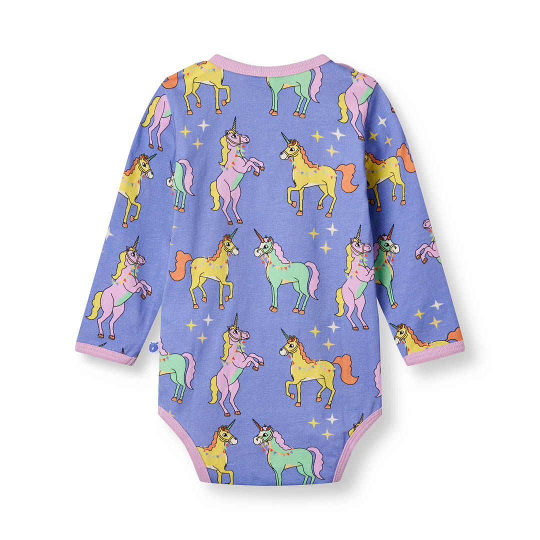 Langærmet baby body med enhjørninger produceret i en økologisk og strækbar bomuldsjersey. Denne body er OEKO-TEX Standard 100® certificeret, hvilket betyder at denne body er produceret og testet for skadelige stoffer, så du kan passe på dit barns hud og helbred.
