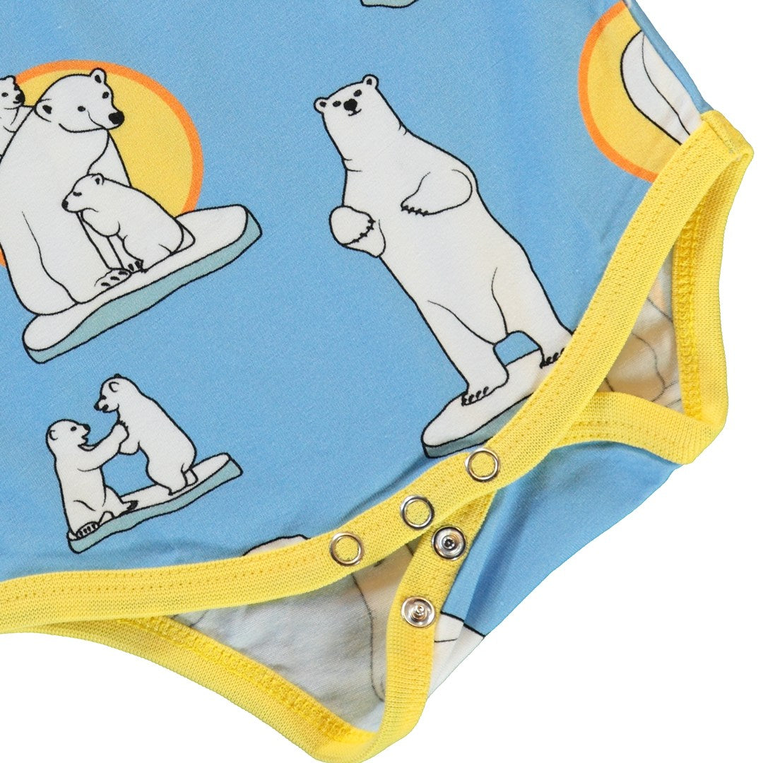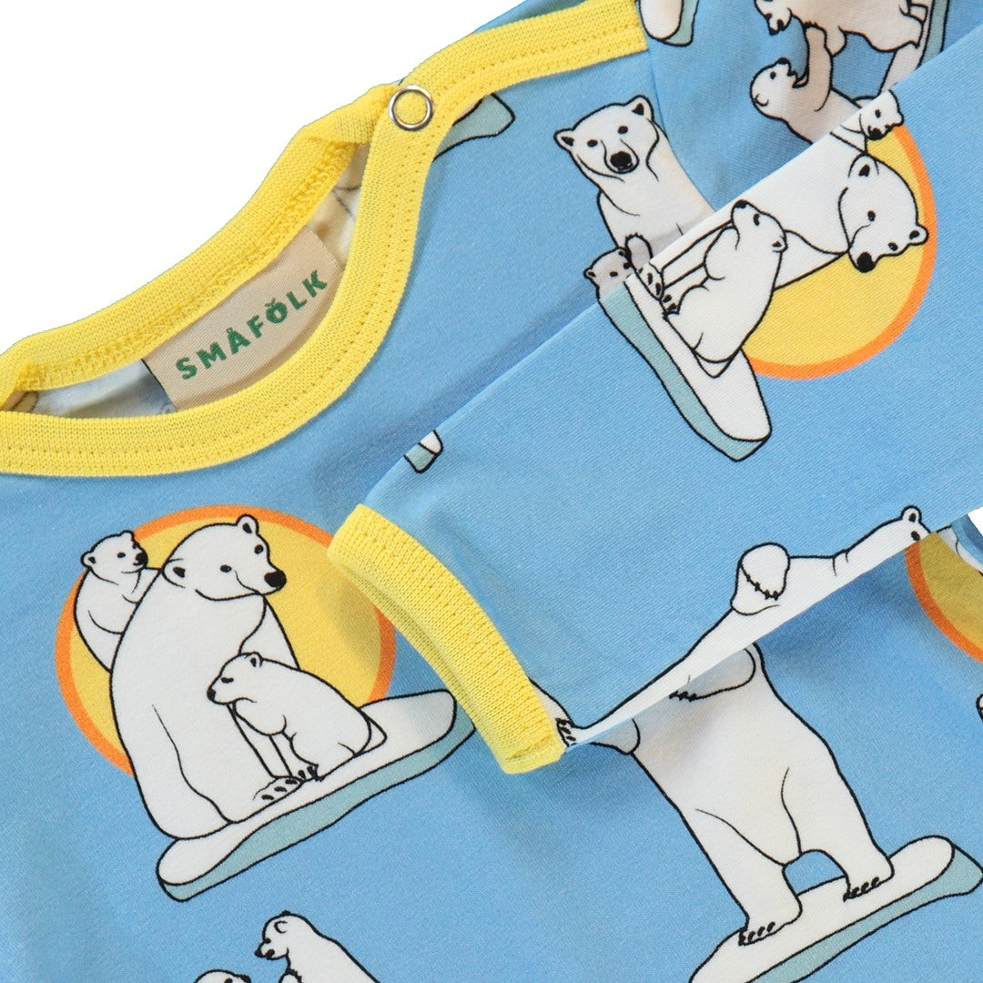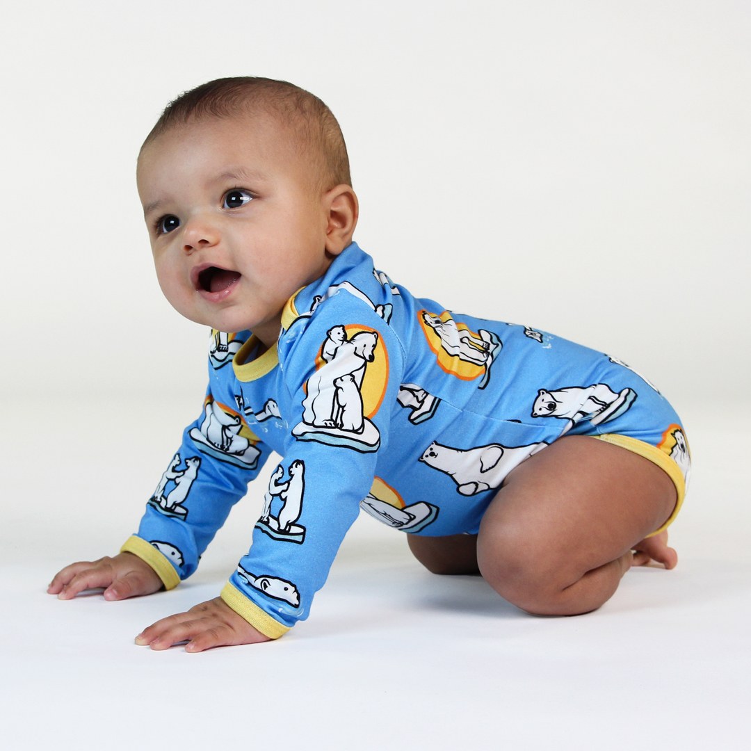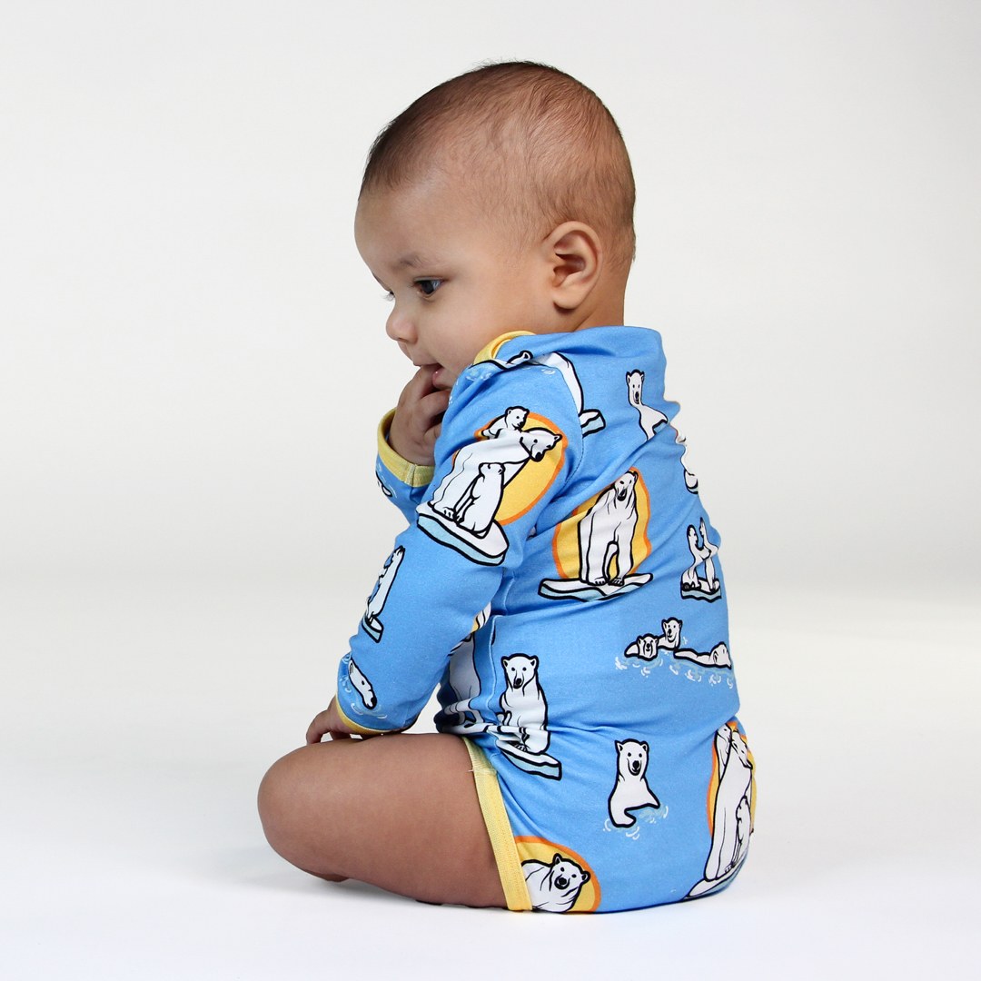 Isbjørnene svømmer i det kolde vand, på vej ud på nye eventyr. Nogle af ungerne leger på isen, og nogle af dem nyder den smukke solnedgang. Dette isbjørneprint er meget enkelt, men tilføjer stadig en masse farve til dit barns garderobe. Småfolks print er tegnet med fokus på glade farver, detaljer og historier. Vores bodyer er en god måde at tilføje personlighed til dit barns garderobe, samtidig med at dit barn kan føle sig komfortabel hele dagen.