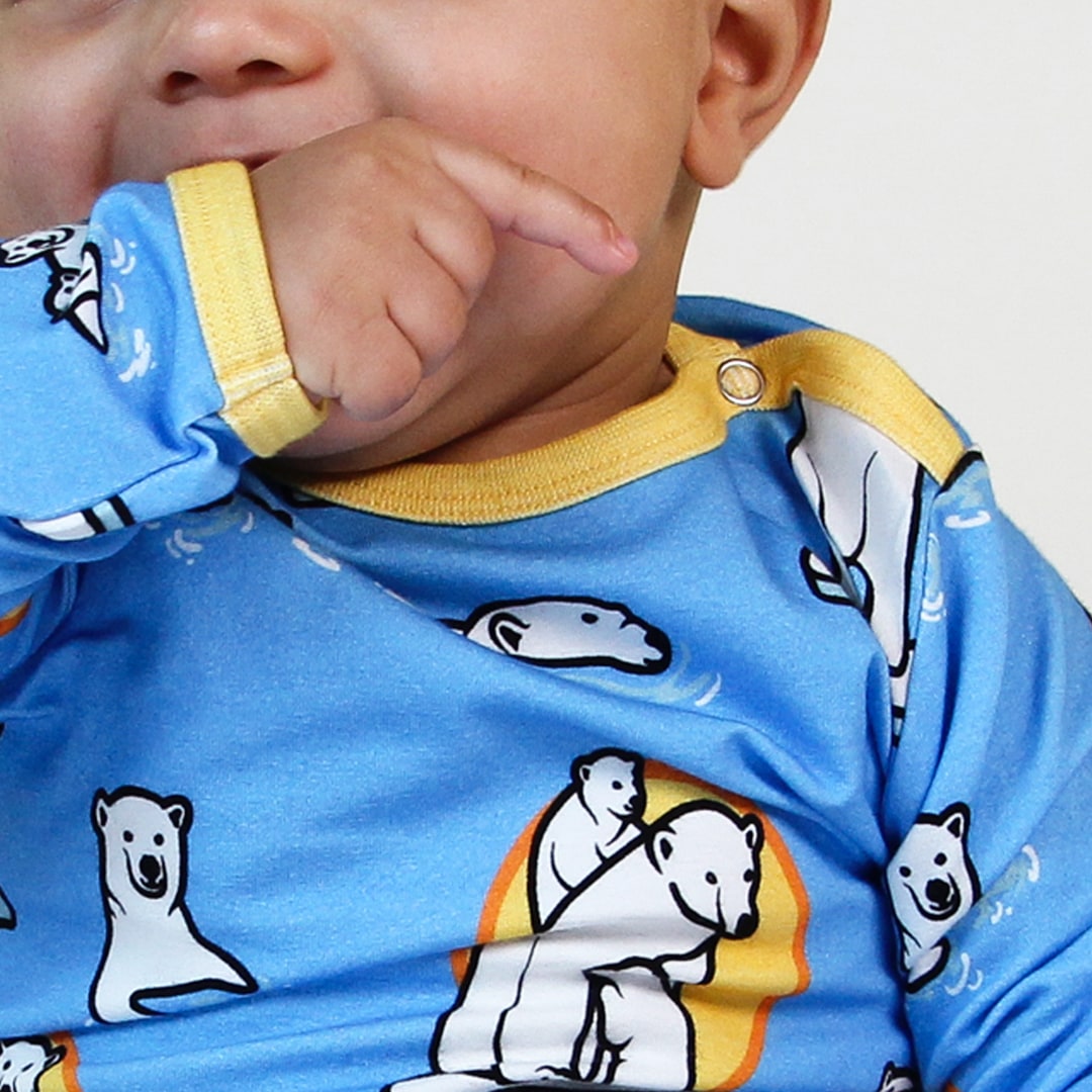 Langærmet baby body med isbjørne, produceret i en økologisk og strækbar bomuldsjersey. Denne body er OEKO-TEX Standard 100® certificeret, hvilket betyder at denne body er produceret og testet for skadelige stoffer, så du kan passe på dit barns hud og helbred.