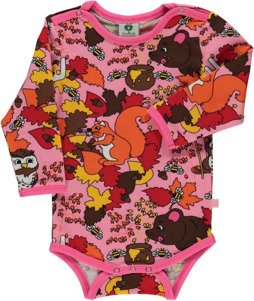 Langærmet body med skovens dyr, produceret i en økologisk og strækbar bomuldsjersey. Denne body er OEKO-TEX Standard 100® certificeret, hvilket betyder at denne body er produceret og testet for skadelige stoffer, så du kan passe på dit barns hud og helbred. Denne body er designet med trykknapper på skuldrene samt for neden, for nemt skift. Småfolks body er designet i Danmark med tanke på at kunne holde til utallige eventyrer og leg, og bevare form og farver selv efter gentagen brug.