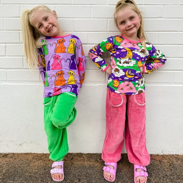 Bukserne har en klassisk afslappet pasform og har lommer med klassisk hvid kantbånd samt matchende kantbånd langs siderne for et rent look. Bukserne har en elastisk linning med snørebånd til justering og elastiske manchetter for nem bevægelse og komfort hele dagen. Fløjlsteksturen giver en fyldig følelse, hvilket gør disse bukser perfekte til både leg og særlige lejligheder. Småfolks bukser er designet i Danmark med det formål at kunne holde til utallige eventyr og leg og bevare form og farve selv efter gentagen brug.