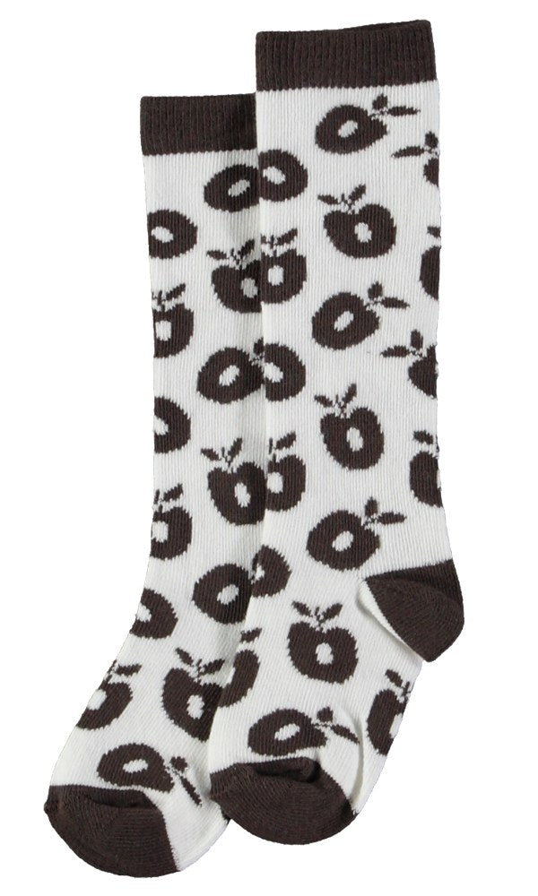 Knæstrømper med æbler, produceret i bomuld. Disse strømper er OEKO-TEX Standard 100® certificeret, hvilket betyder at strømperne er produceret og testet for skadelige stoffer, så du kan passe på dit barns hud og helbred.