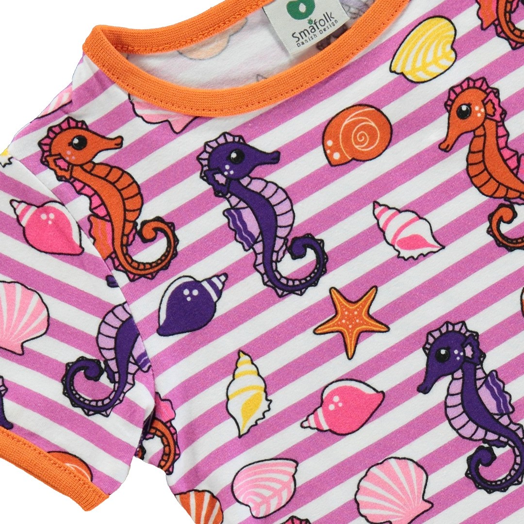 T-shirt med søheste, produceret i en økologisk og strækbar bomuldsjersey. Denne t-shirt er OEKO-TEX Standard 100® certificeret, hvilket betyder t-shirten er produceret og testet for skadelige stoffer, så du kan passe på dit barns hud og helbred. Denne t-shirt har en normal pasform og ribkant i hals og ærmer. Småfolks t-shirts er designet i Danmark med tanke på at kunne holde til utallige eventyrer og leg, og bevare form og farver selv efter gentagen brug.