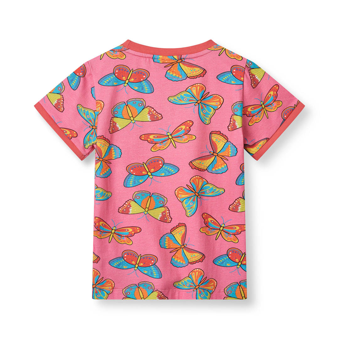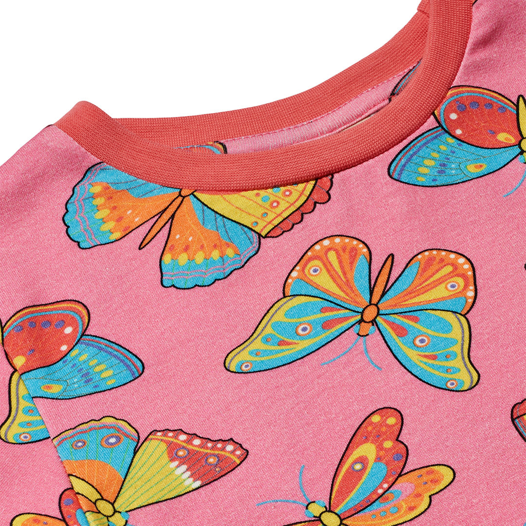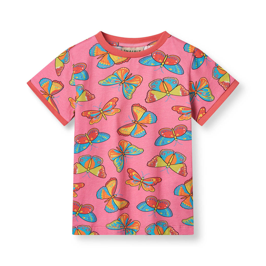 T-shirt med sommerfugle, produceret i en økologisk og strækbar bomuldsjersey. Denne t-shirt er OEKO-TEX Standard 100® certificeret, hvilket betyder t-shirten er produceret og testet for skadelige stoffer, så du kan passe på dit barns hud og helbred.