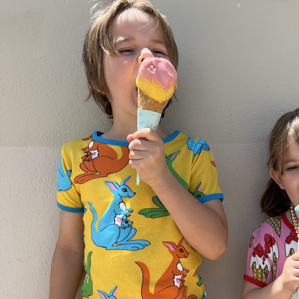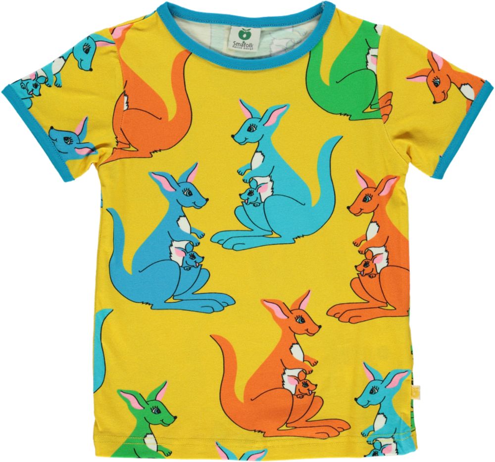 T-shirt med kænguruprint, i Småfolks helt egen unikke retro stil. T-shirten er designet i Danmark og produceret i den aller bedste 100 % økologiske bomuld samt elastan, som gør T-shirten strækbar, blød og samtidig holder pasformen. Småfolks T-shirts er i flotte klare farver som dit barn kan lege, vokse og udforske deres fantasier i, samtidig med at barnet kan bevæge sig frit.