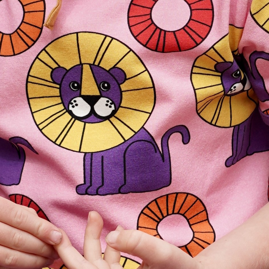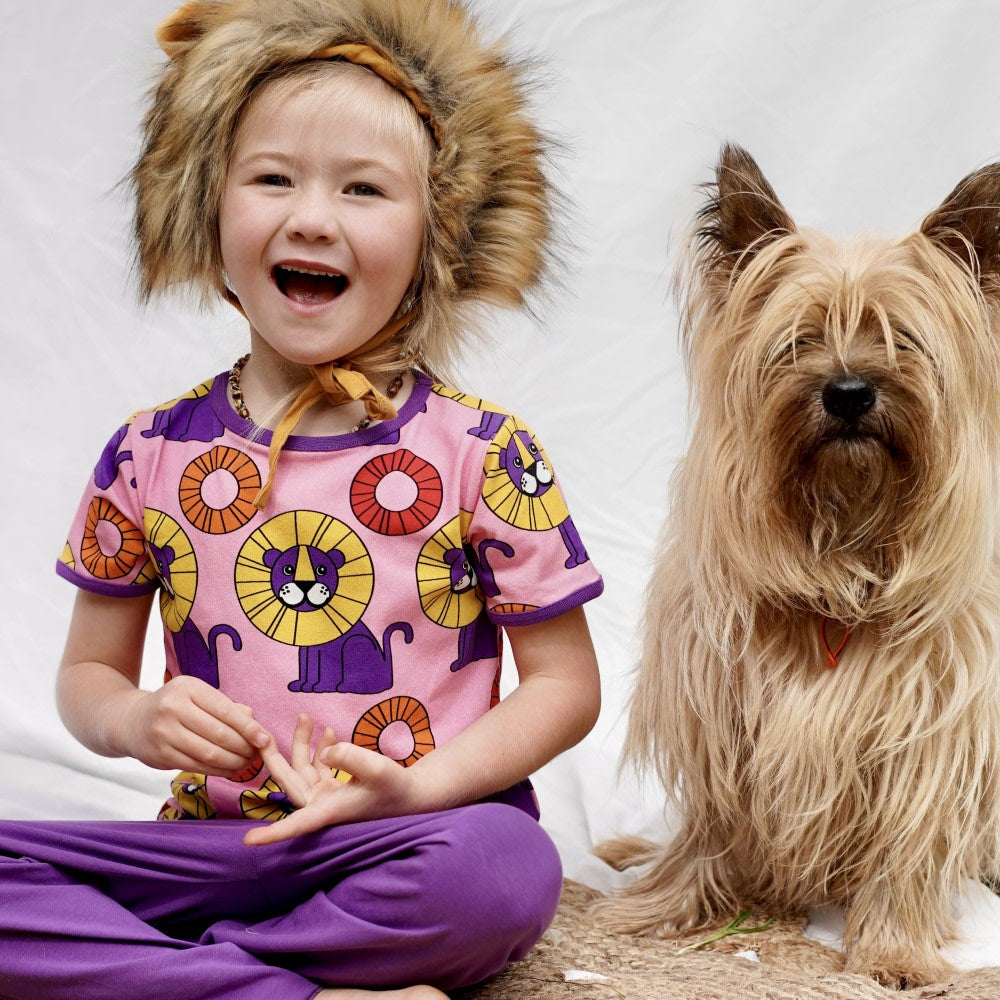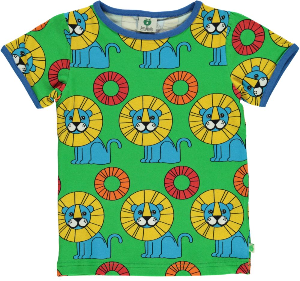 T-shirt med sol- og løveprint, i Småfolks helt egen unikke retro stil. T-shirten er designet i Danmark og produceret i den aller bedste 100 % økologiske bomuld samt elastan, som gør T-shirten strækbar, blød og samtidig holder pasformen. Småfolks T-shirts er i flotte klare farver som dit barn kan lege, vokse og udforske deres fantasier i, samtidig med at barnet kan bevæge sig frit.