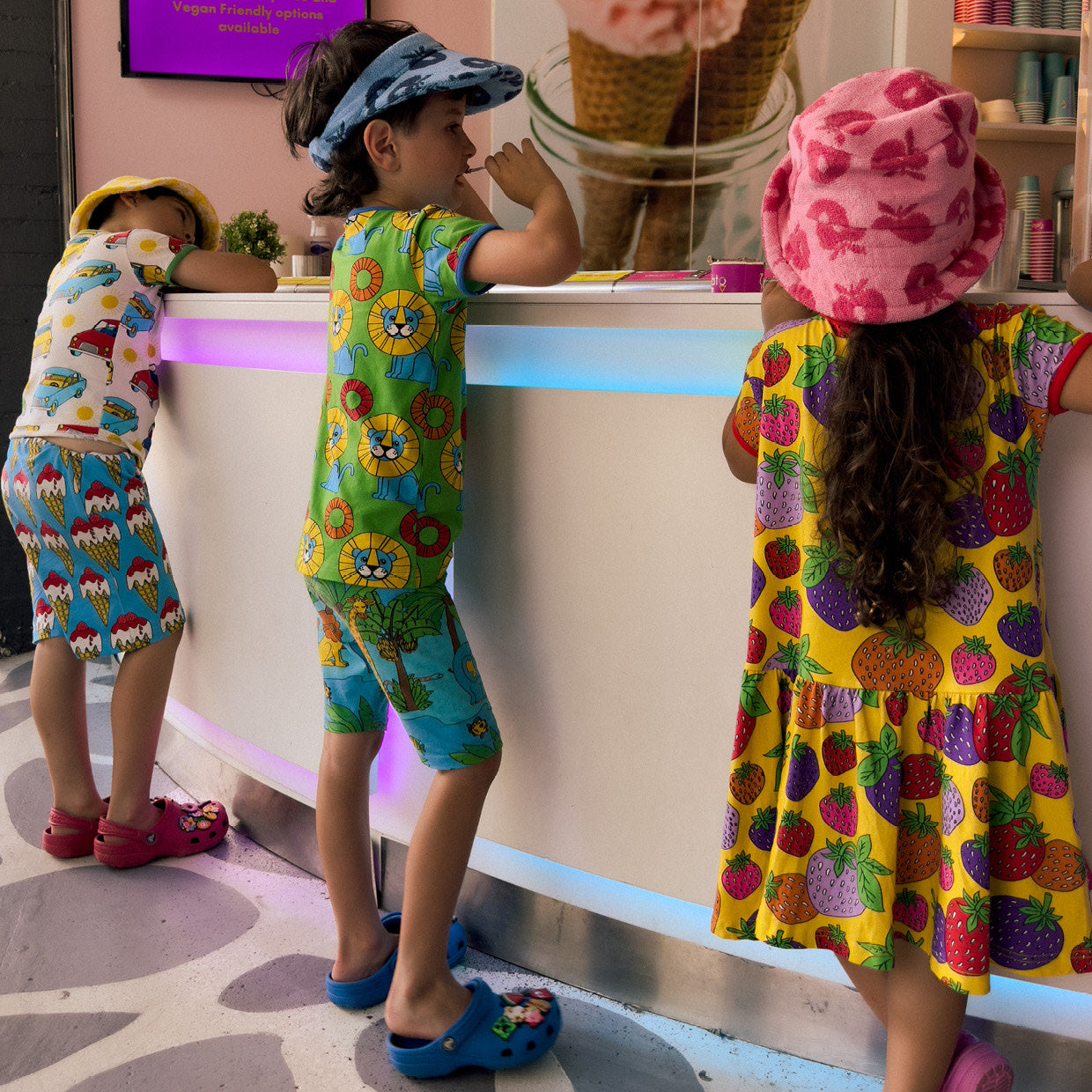 Vi bruger digital print på vores styles, hvilket bruger langt mindre vand i produktionen og også minimere spild af stof, da vi kan lave færre meter stof end ved andre printmetoder (fx rulleprint). Og så giver digital print os også mulighed for at bruge mange flere farver ad gangen – og det er vi glade for, for vi elsker farver.