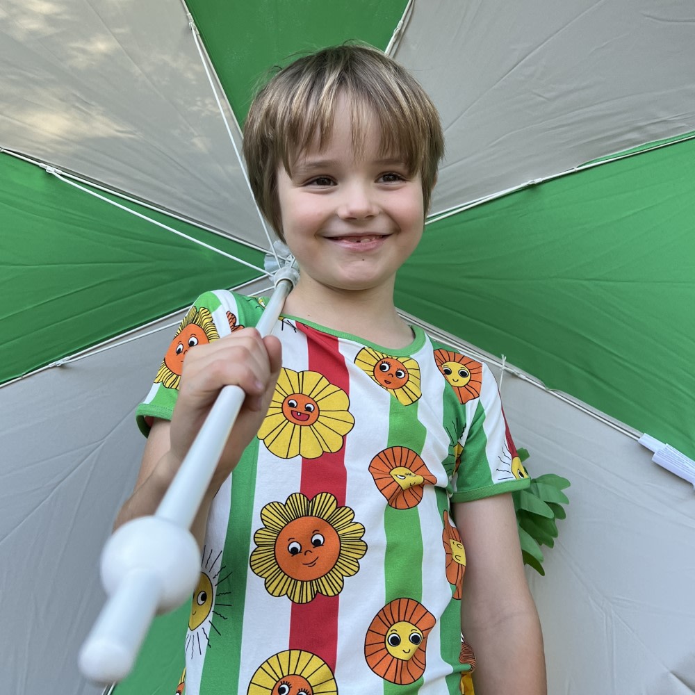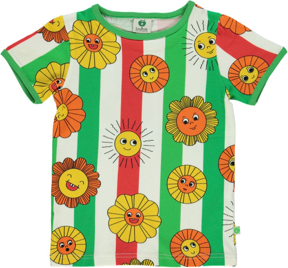T-shirt med striber og soleprint, i Småfolks helt egen unikke retro stil. T-shirten er designet i Danmark og produceret i den aller bedste 100 % økologiske bomuld samt elastan, som gør T-shirten strækbar, blød og samtidig holder pasformen. Småfolks T-shirts er i flotte klare farver som dit barn kan lege, vokse og udforske deres fantasier i, samtidig med at barnet kan bevæge sig frit.