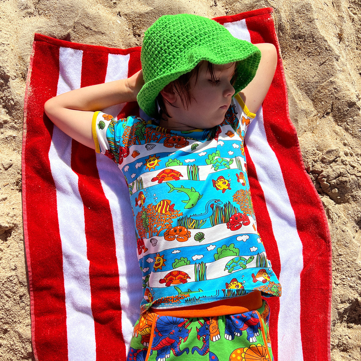 Husk dog altid solcreme. Vi anbefaler at du smører solcreme over hele kroppen på barnet (20 minutter inden i går ud i solen og efter hver badetur), så er du sikker på at barnet ikke bliver solskoldet, hvis UV badetøjet tages af.