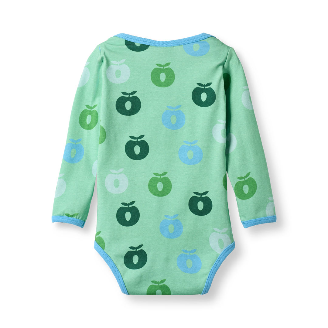 Langærmet baby body med æbler produceret i en økologisk og strækbar bomuldsjersey. Denne body er OEKO-TEX Standard 100® certificeret, hvilket betyder at denne body er produceret og testet for skadelige stoffer, så du kan passe på dit barns hud og helbred.