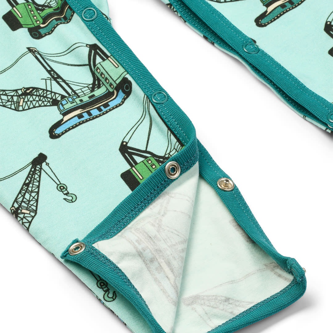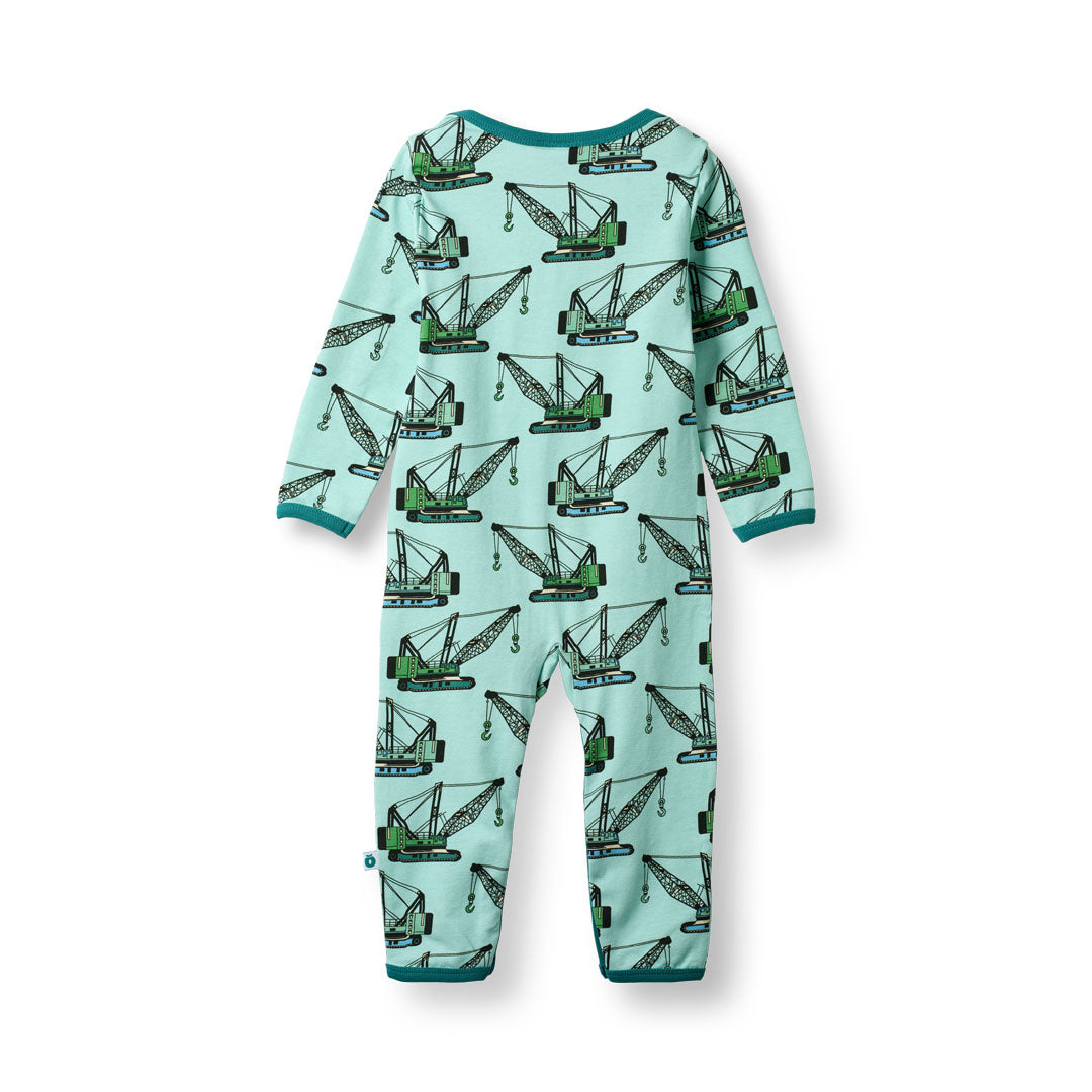Heldragt til baby med kran maskiner, produceret i en økologisk og strækbar bomuldsjersey. Denne heldragt er OEKO-TEX Standard 100® certificeret, hvilket betyder at dragten er produceret og testet for skadelige stoffer, så du kan passe på dit barns hud og helbred.