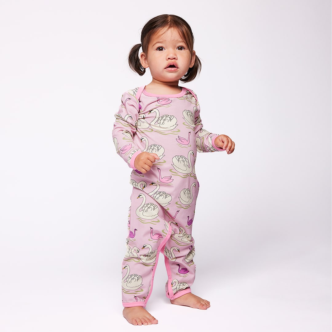 Glid ind i et finurlig eventyr med vores elegante svaneprint, perfekt til de små, der elsker yndefulde øjeblikke og eventyrdrømme. Småfolks print er tegnet med fokus på glade farver, detaljer og historier. Vores heldragter til babyer er en god måde at tilføje personlighed til dit barns garderobe, samtidig med at dit barn kan føle sig komfortabel hele dagen.