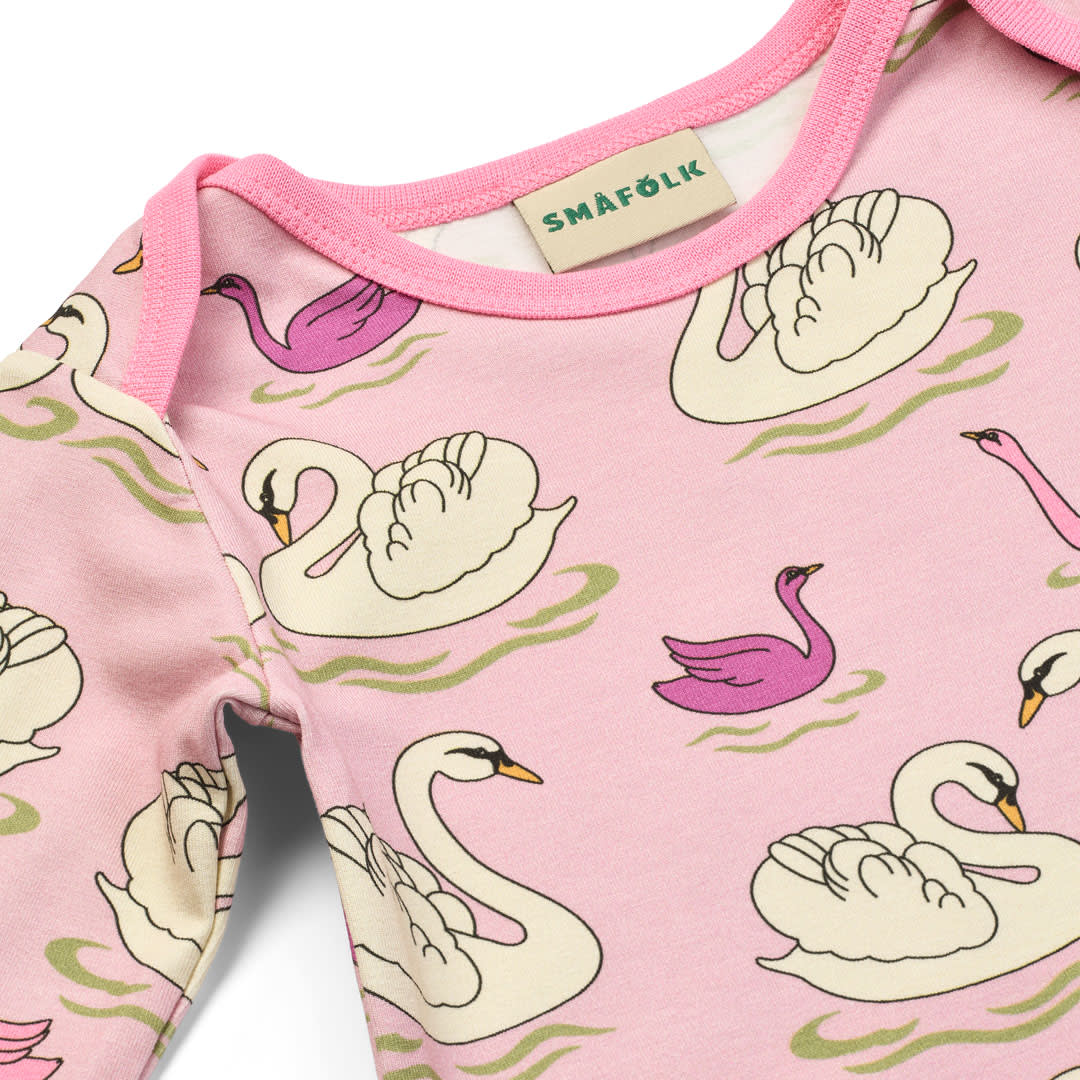 Heldragt til baby med svaner, produceret i en økologisk og strækbar bomuldsjersey. Denne heldragt er OEKO-TEX Standard 100® certificeret, hvilket betyder at dragten er produceret og testet for skadelige stoffer, så du kan passe på dit barns hud og helbred.