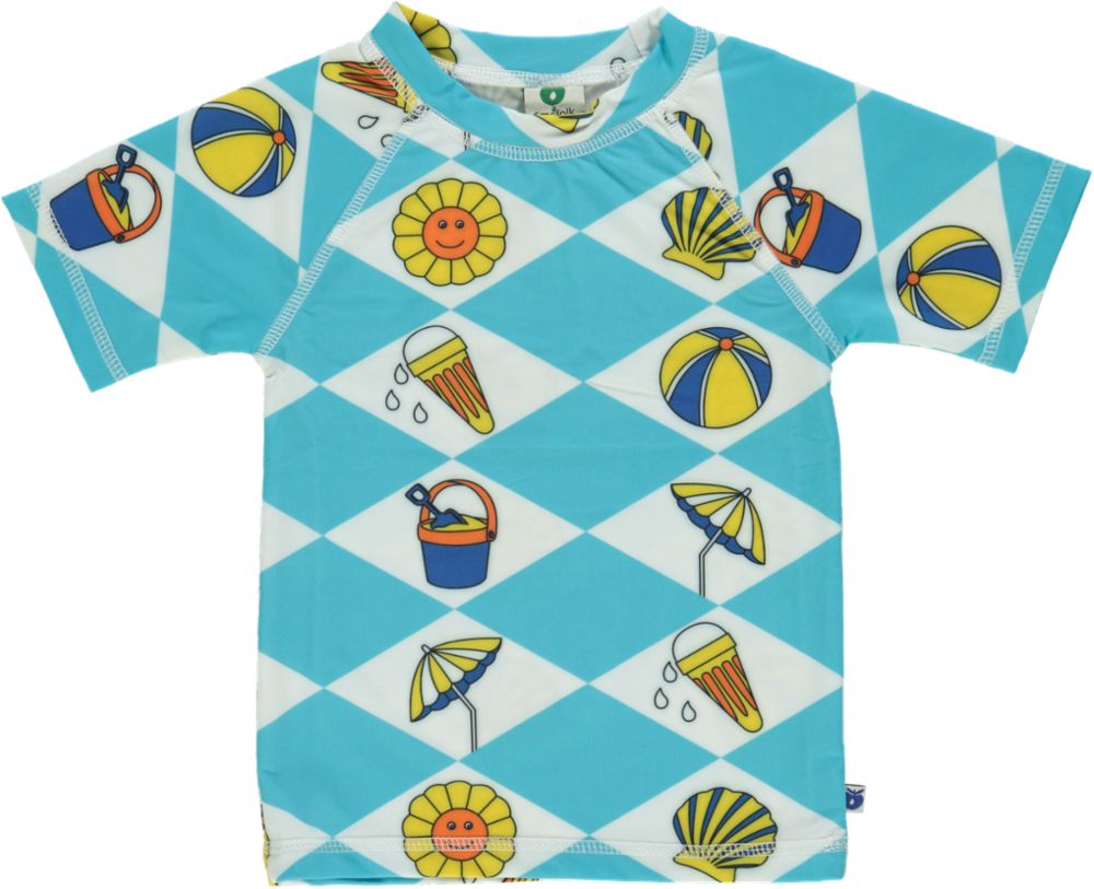 Bade T-shirt med harlekin- og sommerprint, i Småfolks helt egen unikke retro stil. T-shirten har korte ærmer. Småfolk's badetøj beskytter dit barns hud med UPF50+ UV faktoren er strikket ind i stoffet. For at badetøjet holder sine fine farver anbefaler Småfolk at badetøjet skylles i rent koldt vand fra hanen. Undgå at tørre i direkte sollys samt undgå al brug af tørretumbler. For at bevarer den glatte overflade anbefaler vi at undgå al kontakt med ru overflader. Rigtig god fornøjelse i vandet med dit Småfolk badetøj.