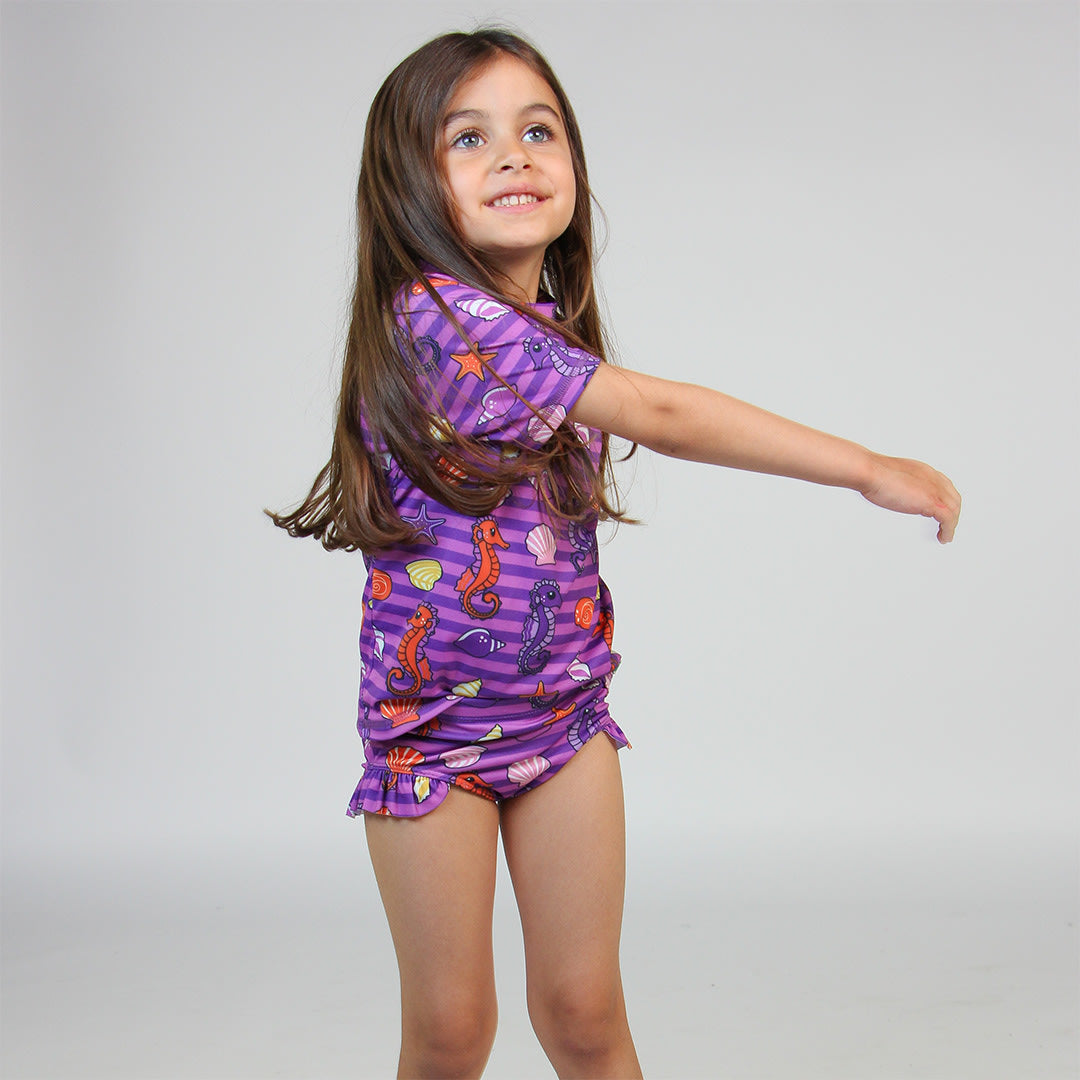 UV50 t-shirt med søheste, produceret i strækbar og slidstærk polyester. Småfolks badetøj beskytter dit barns hud med UPF50+ UV-faktoren strikket ind i stoffet. T-shirten har en normal pasform og korte ærmer. Småfolks badetøj er designet i Danmark med tanke på at kunne holde til utallige eventyrer og leg, og bevare form og farver selv efter gentagen brug. For at badetøjet holder sine flotte farver, anbefaler Småfolk, at badetøjet skylles i rent koldt vand fra hanen. Undgå at tørre i direkte sollys og undgå al brug af tørretumblere. For at bevare den glatte overflade anbefaler vi at undgå al kontakt med ru overflader.