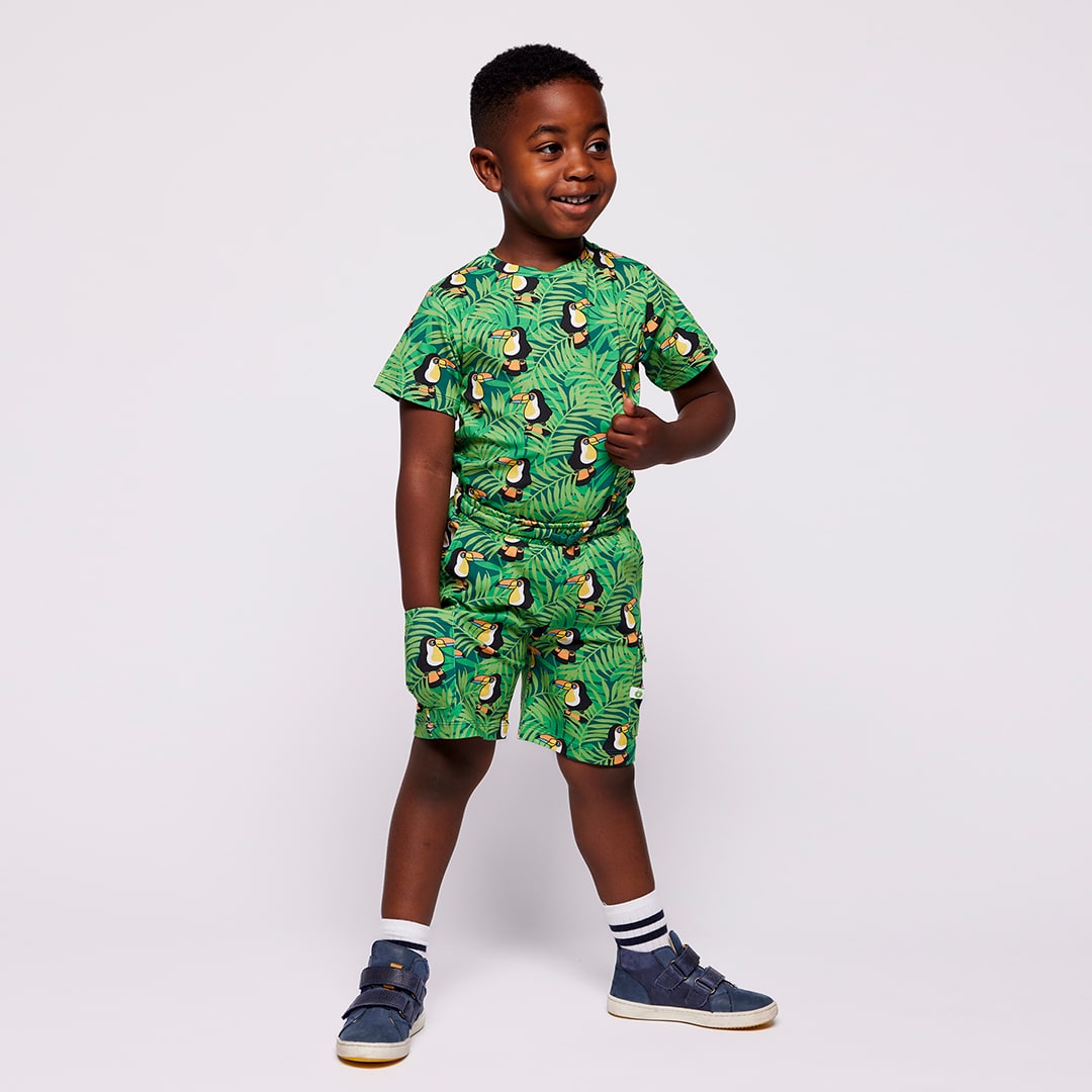 Muntre tukaner titter frem fra tætte jungleblade i dette livlige print fuld af tropisk charme og legende energi. Småfolks print er designet med fokus på glade farver, detaljer og historier. Vores shorts er en fantastisk måde at tilføje personlighed til dit barns garderobe, samtidig med at dit barn holder sig komfortabelt hele dagen.